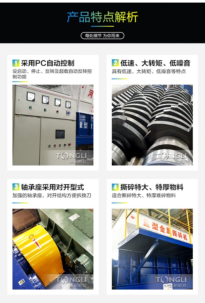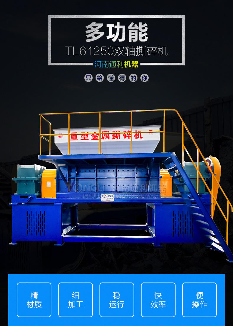 河南通利生产的汽车外壳撕碎机本机采用微电脑(PC)自动控制,设启动、停止、反转及载自动反转控制功能,具有低速、转矩、低噪音等特点。适合撕碎较厚难碎的物料如:电脑硬盘、废旧金属、家电产品、汽车水箱等。